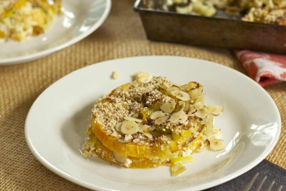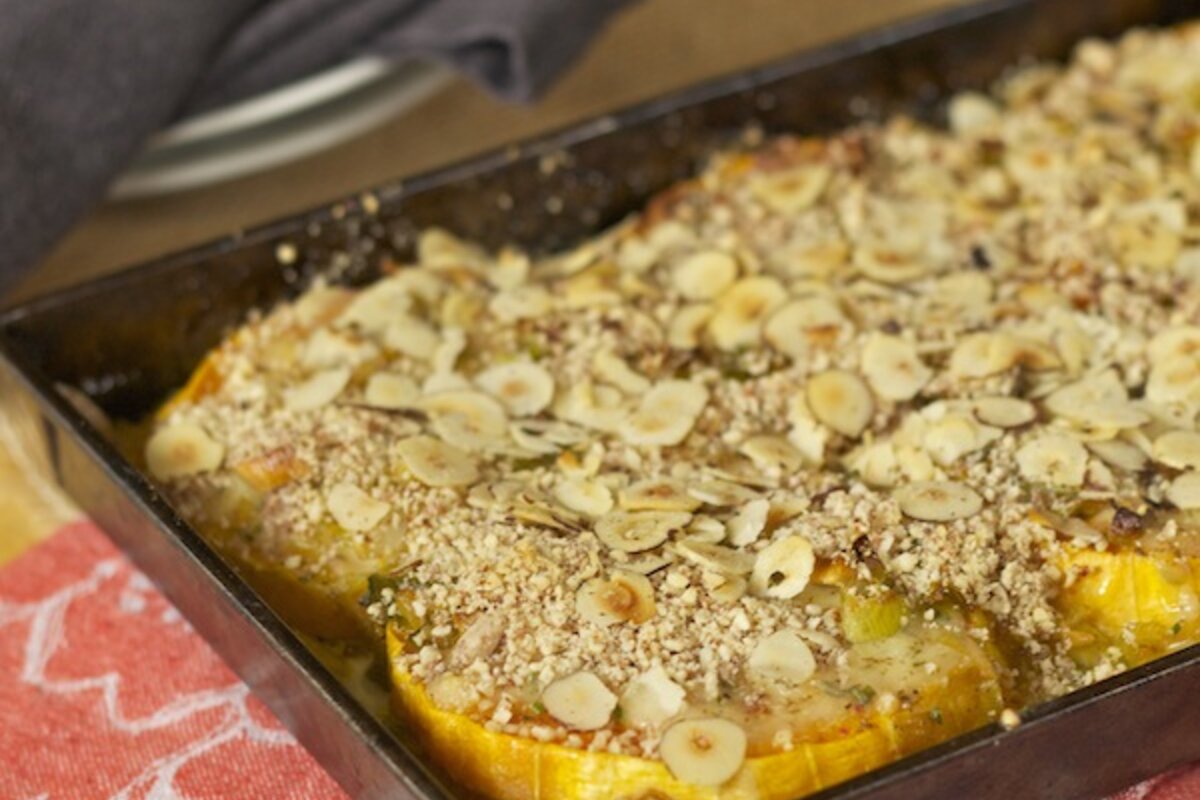 3. Grease a 9脳9-inch baking dish (I used a 6x11-inch). Put half the squash slices (or cubes) in a single layer at the bottom of the pan. Top with half the cooked leeks and half the grated cheese. Sprinkle with salt and pepper. Add a final layer of squash, top with remaining leeks, followed by the cheese. Pour the cream mixture over the squash. Sprinkle with almond meal and hazelnuts.
