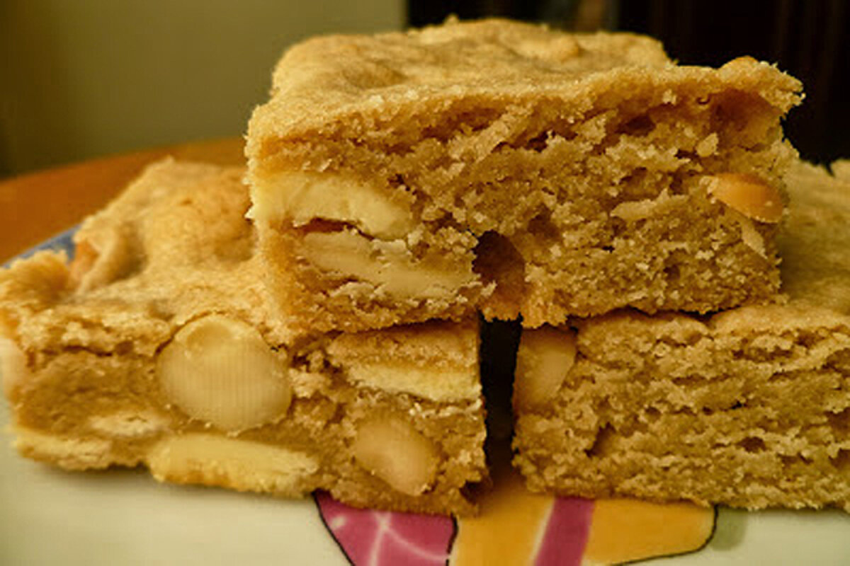 This is a bar cookie I made for a charity fundraiser, . I already had but I had more macadamias and white chocolate on hand so I forged ahead with a bar cookie version just to make sure I had enough baked goods to bring to the bake sale. I was baking a lot of stuff the day before the bake sale and I couldn't taste test them all. I ended up only having (literally) a sliver of this just to make sure it was OK. I think it was.