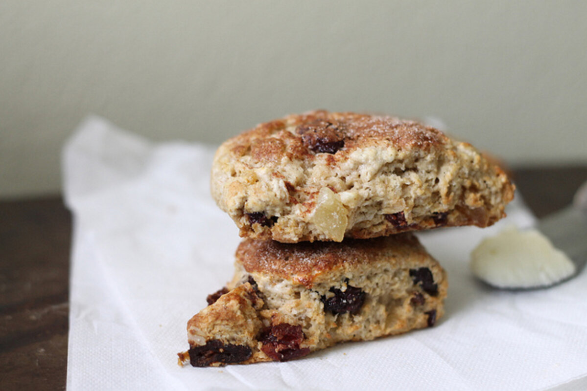 So many things can be subbed out for the ginger and dried cranberry. Add raisins. Or no dried fruit. Or take the sugar out and add shredded cheddar and dried dill instead. I often serve them that way with soup. Or make your own chai spice mixture and use dried apricots and figs.