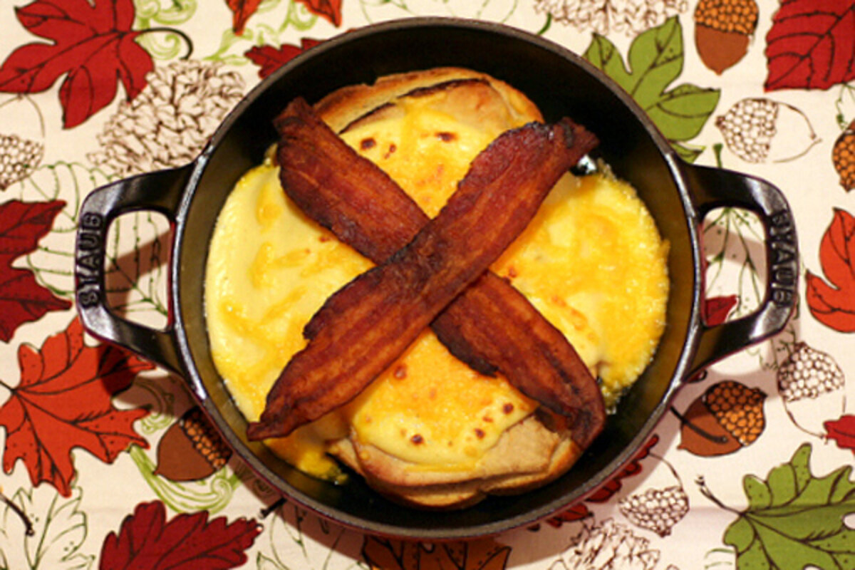 3. Broil the hot browns until the tops are speckled brown and bubbling, about 5 minutes 鈥 but watch carefully. Lay the bacon slices on top of the hot browns and serve immediately.