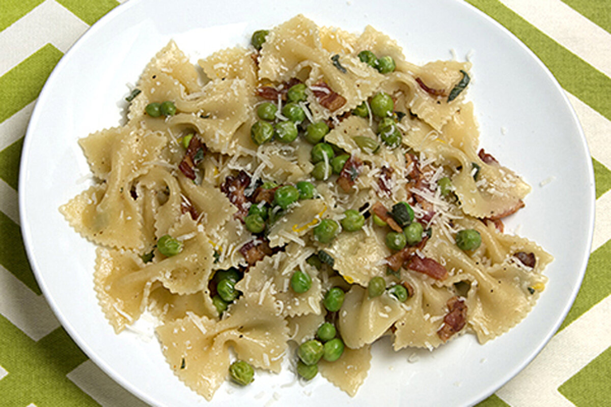 Butterflies and a taste of spring: Farfalle with peas, bacon, and sage butter