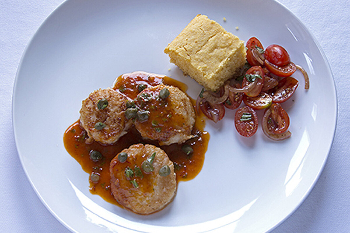 Assemble the dish:聽Arrange 3 scallops on each plate, drizzle with the sauce, then add a square of warm cornbread and an artful arrangement of the tomato salad. Serve.