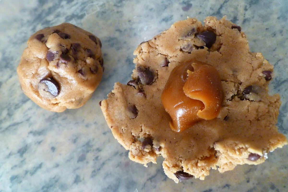 I also used mostly mini chocolate chips and only a handful of regular-sized semisweet chocolate chips. With stuffed chocolate chip cookies where you encase the caramel inside the dough, larger chips become a liability because they create potential gaps around the cookie dough that the caramel stuffing can escape from. You don't want that. In this case, you also don't want too many chips, regardless of size, for the same reason. If you're the type of person who likes enough chocolate chips just to barely hold the dough together, instead of making these as regular "drop" cookies, place the dough in a ramekin, drop a dollop of caramel over it, cover with more dough then bake. That way you don't have to worry about the caramel leaking out and hardening during baking on a cookie sheet.