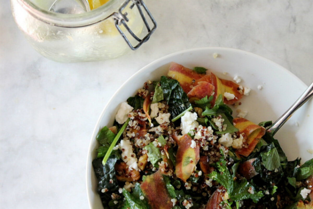 This serves one, but if you're serving more, just get out a big bowl and fill accordingly! In a bowl, combine a handful of聽cold grains聽with lots of聽chopped kale/greens/herbs. Here, I've used black kale, mint, chives, mustard greens, Italian parlsey, and lovage from my garden. Plain old romaine would work, too 鈥 you just want something with crunch (versus red or green leaf lettuce). Add a handful of聽toasted walnuts聽(or other seeds/nuts, like sunflower seeds, pepitas, or almonds), some salty聽feta, shaved聽carrots聽(here, red carrots shaved with a vegetable peeler) and toss with a big squeeze of聽lemon juice, salt, pepper, and a glug of olive oil.聽I used juices from my preserved lemon jar, but lemon juice, olive oil, and salt are a fine substitute.