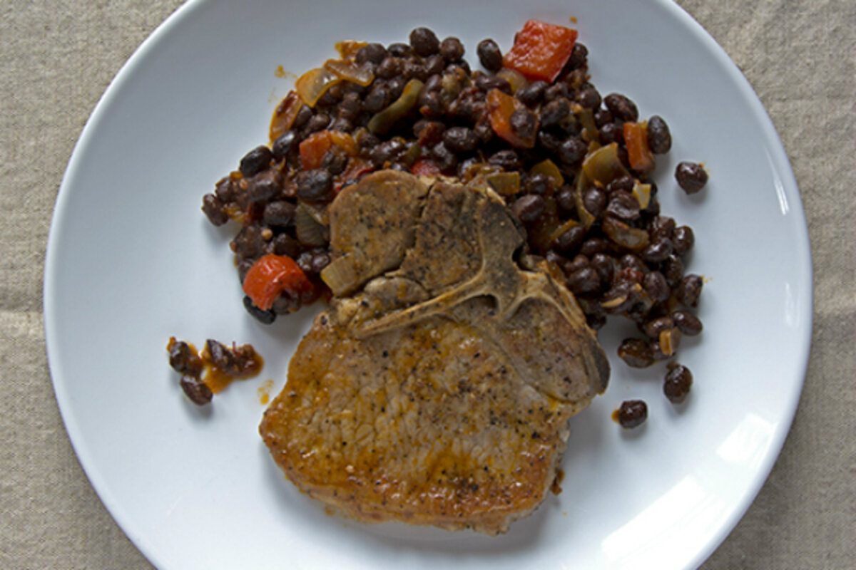 For this recipe, I used the peppers to add some smoke to black beans and red bell pepper 鈥 and to help flavor some pork chops. First, I browned the chops, then, after getting the beans going, braised the chops in the bean mixture. It imparted some of the smoky flavor and plenty of the peppers鈥 beautiful orangey red color to the chops.