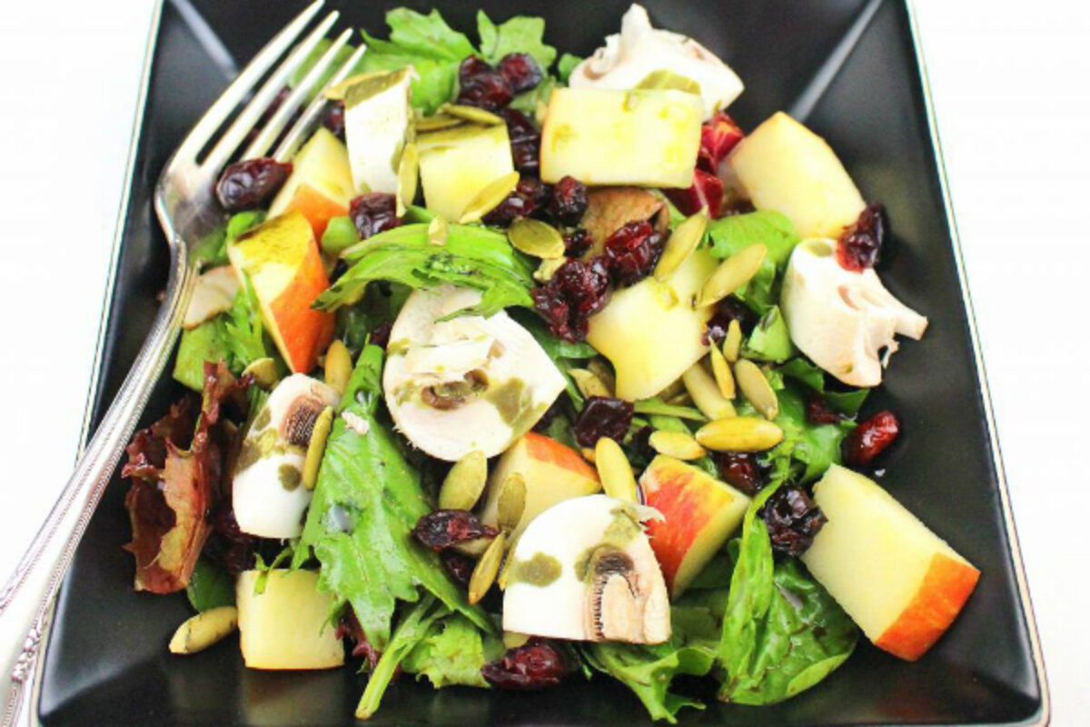 2. Add chopped apple, chopped mushrooms, craisins and pepitas to the salad and gently toss again.