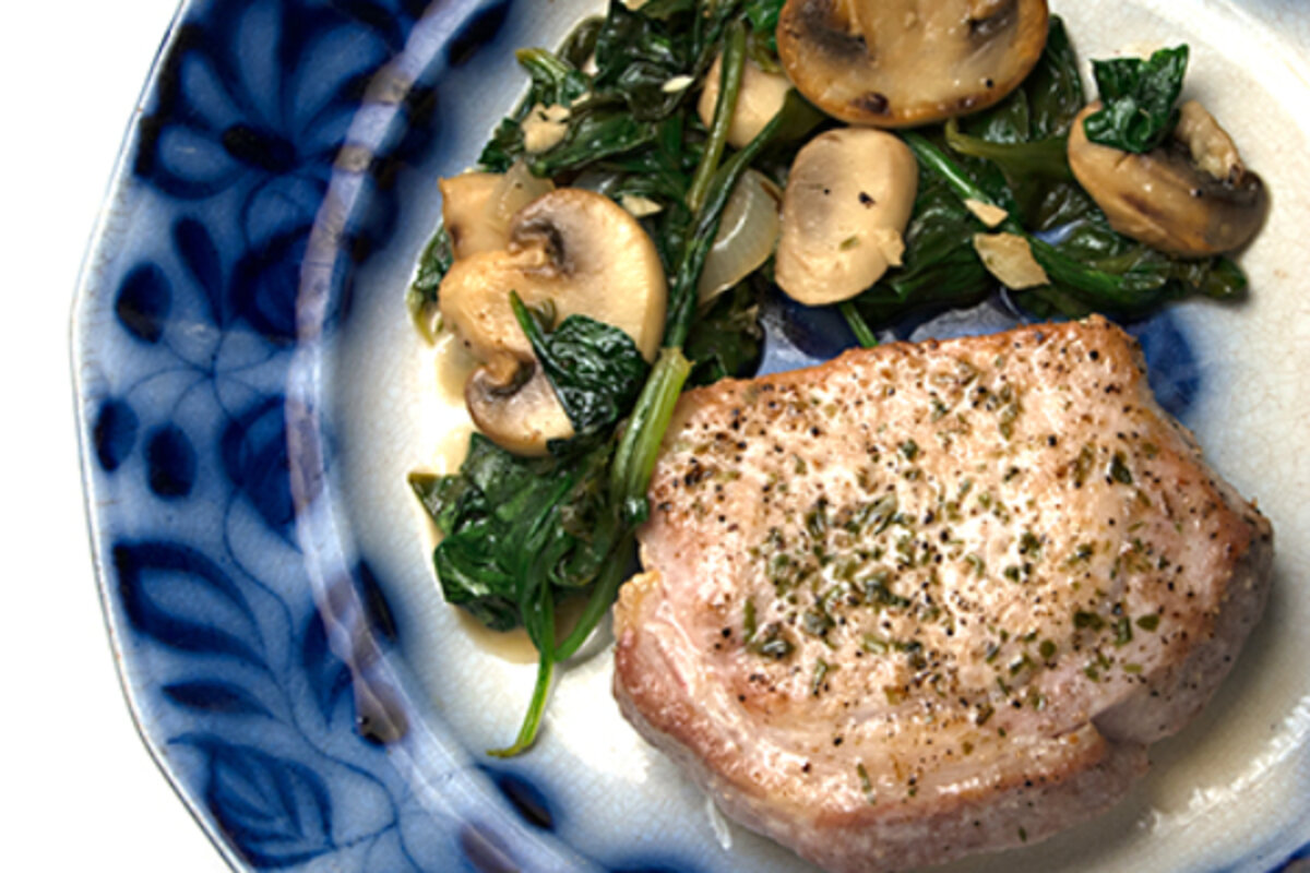 5. Cook until chops are just heated through and cooked to at least 145 degrees F., about 5 minutes, turning once to get lemony juices on both sides. Plate chops and spoon spinach and mushrooms alongside, spooning pan juices over chops. You鈥檒l probably want another side, maybe some garlicky mashed potatoes, or Marion鈥檚 delicious , which we had.