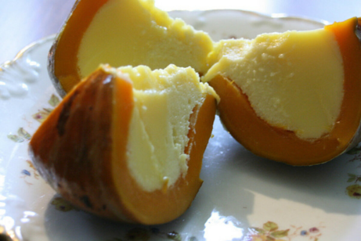 6. Cut the pumpkin into 4 to 8 wedges, depending on how hungry your guests are, and serve cold or warm (heat it up in the microwave). Use a spoon to scoop up some pumpkin flesh together with the custard, making sure you get a little of each with every bite.
