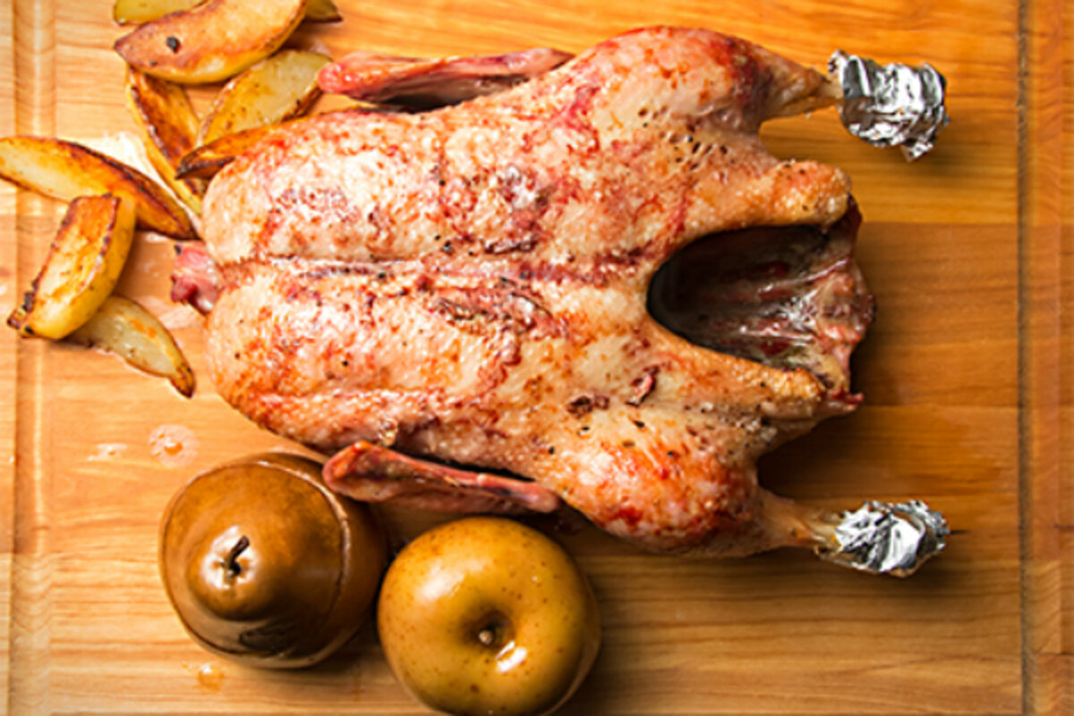 Now, roasting a chicken is certainly fine for a chilly Sunday afternoon. But roasting a duck is a whole other kind of wonderful. As we鈥檝e said in an earlier post, the flavor is richer, meatier and more intense than chicken. Even duck breasts, while considered 鈥渨hite meat,鈥 are darker than chicken or turkey. According to the USDA, it鈥檚 because they are birds of flight, and 鈥渕ore oxygen is needed by muscles doing work, and the oxygen is delivered to those muscles by the red cells in the blood.鈥
