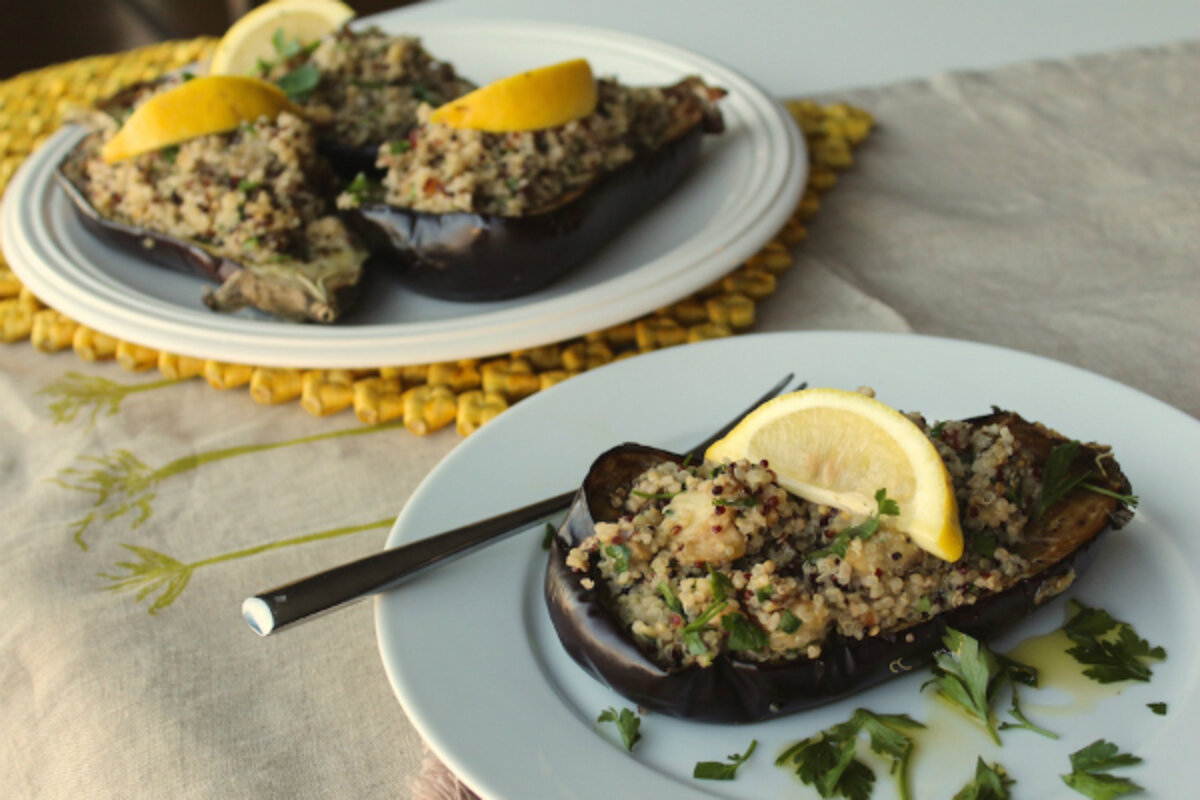 4. Once the eggplant is cooked, scoop out the soft flesh leaving a 1/2-inch perimeter around the skin. Place the cubed flesh (it鈥檚 OK to have pieces that don鈥檛 come out perfectly) and the quinoa in a large bowl. Add the chopped parsley, walnuts and green onions. Add the juice of 1/2 a lemon and salt if required. Stir and taste. Continue to add lemon juice and salt to taste until just right. Finish with fresh ground pepper (optional).