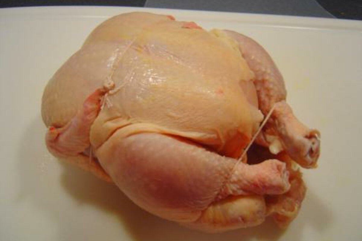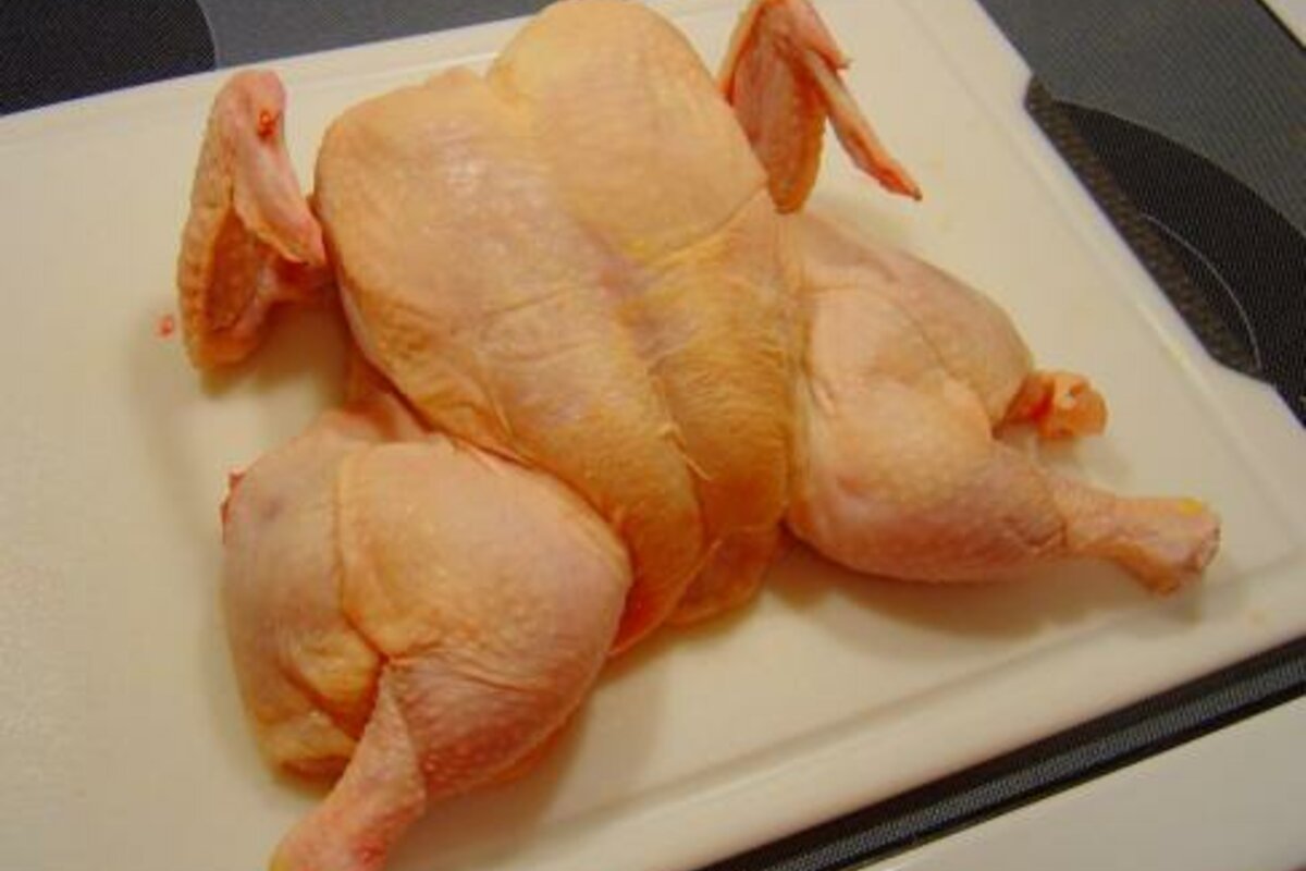 Start with a whole chicken on a cutting board. You don鈥檛 need to rinse it yet unless it is really nasty- because you will rinse it later.