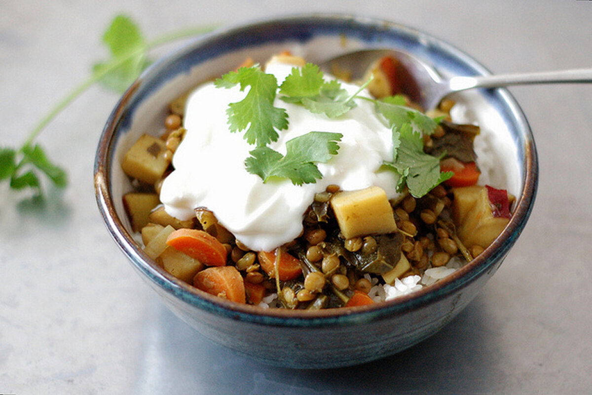 3. Bring to a simmer then turn the heat down a bit and cook, covered, over medium-low heat for 40-45 minutes until the lentils and vegetables are just tender. Add the lime juice and stir well before seasoning to taste with the salt and pepper. You can also add a little sugar if you like. Serve hot over rice topped with whole milk yogurt and fresh cilantro.聽