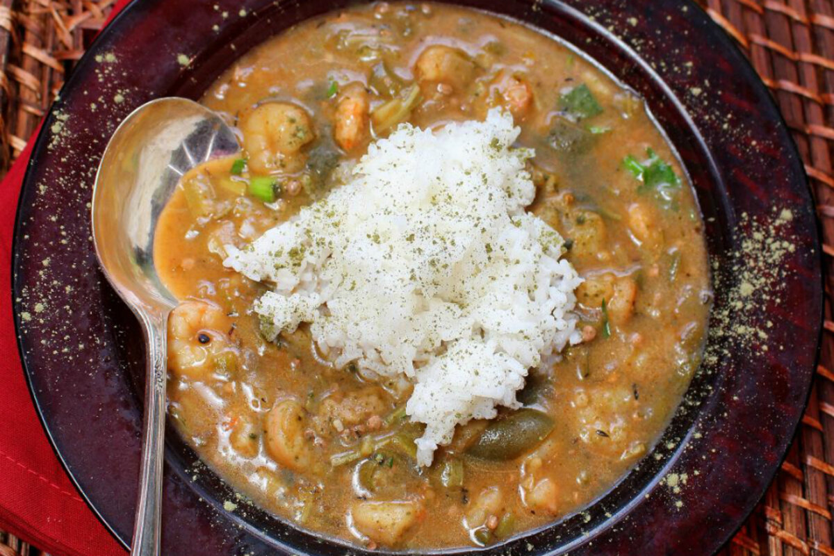 7. Serve gumbo with steamed white rice, garnished with extra parsley or scallion and gumbo file if desired.