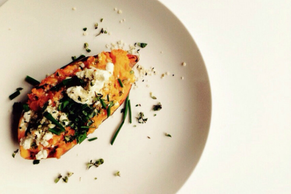 3. Spoon mixture back into skins, top with a little more feta, and bake until warmed through, about 20 minutes. Broil at the last minute. Take out, top with hemp seeds and herbs.