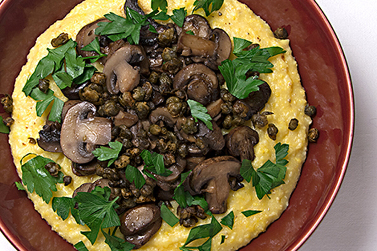 Creamy polenta with mushrooms and fried capers