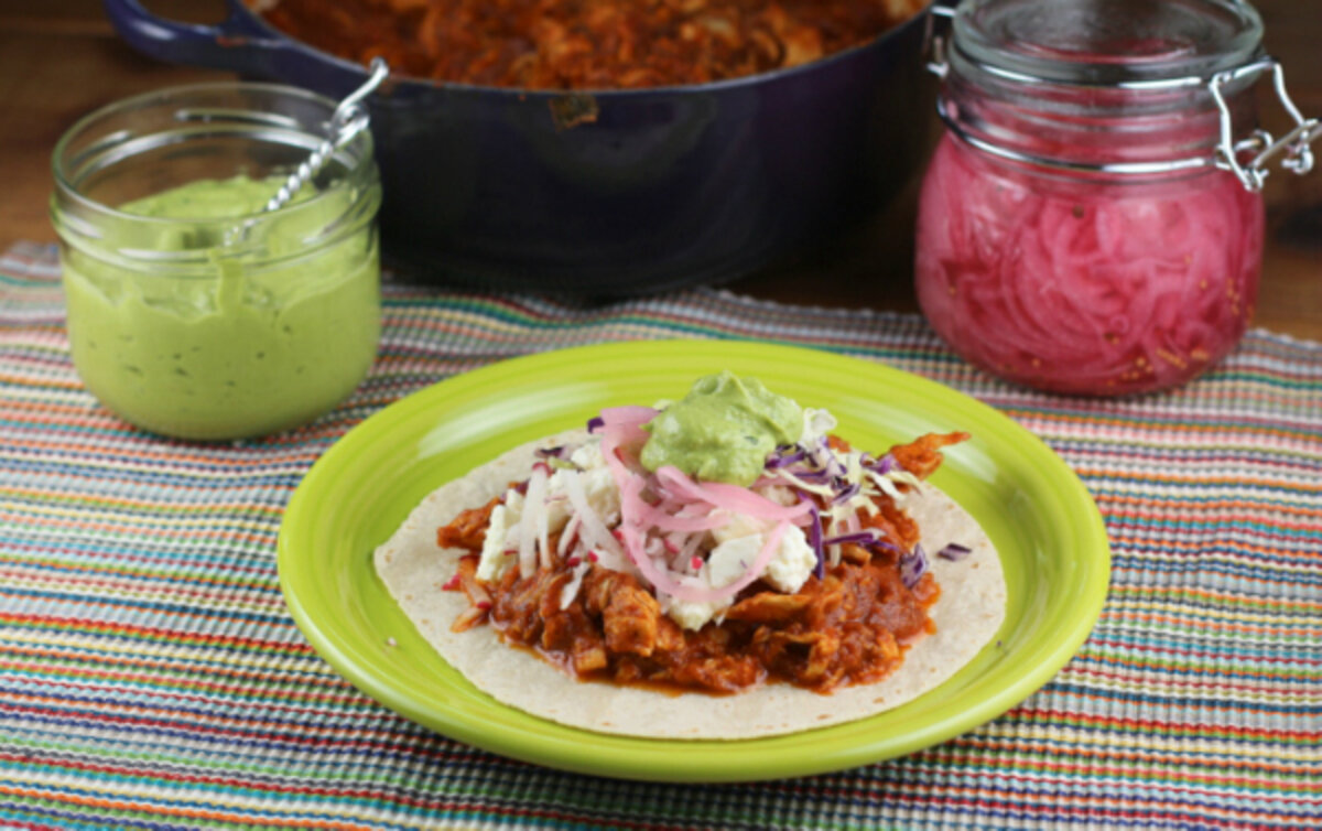 I love to pull out a full array of colorful toppings to add crunch and creaminess and counterpoints to the smoky chipotle flavor. Simply pickled red onions are traditional and the vinegar tang complements to rich meat perfectly and this creamy avocado sauce cools everything down. Make this for family taco night or invite friends over for a Mexican meal. I think this would also make a great book club dish, too.