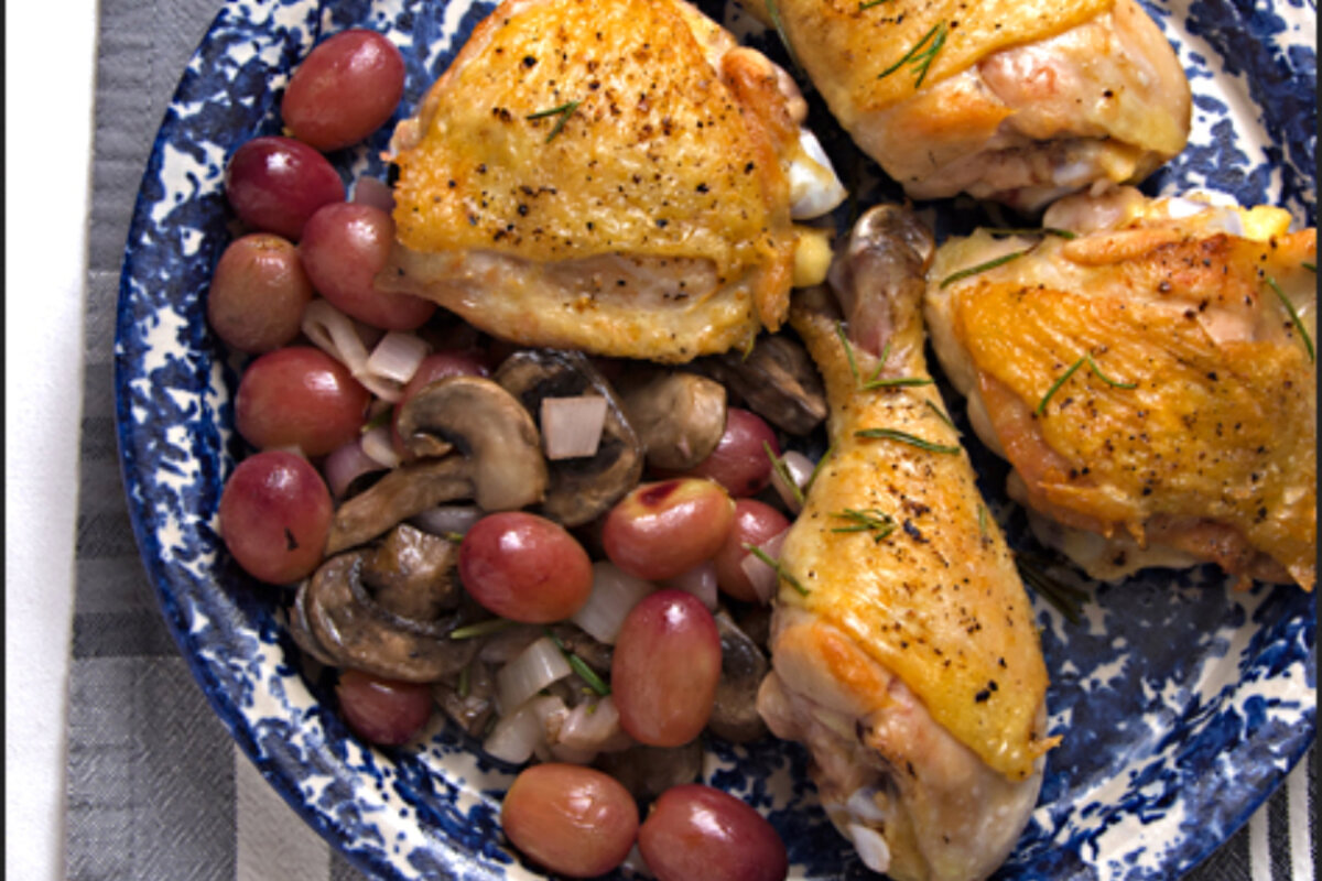 For this dish, I chose red seedless grapes 鈥 they were beautiful and available. Black grapes would work well too, as would green grapes. The grapes are roasted in chicken fat along with mushrooms, shallots, and rosemary. The result is sweet, earthy, and savory, a perfect accompaniment to the roasted chicken thighs and drumsticks. And a delicious way to celebrate the changing seasons.