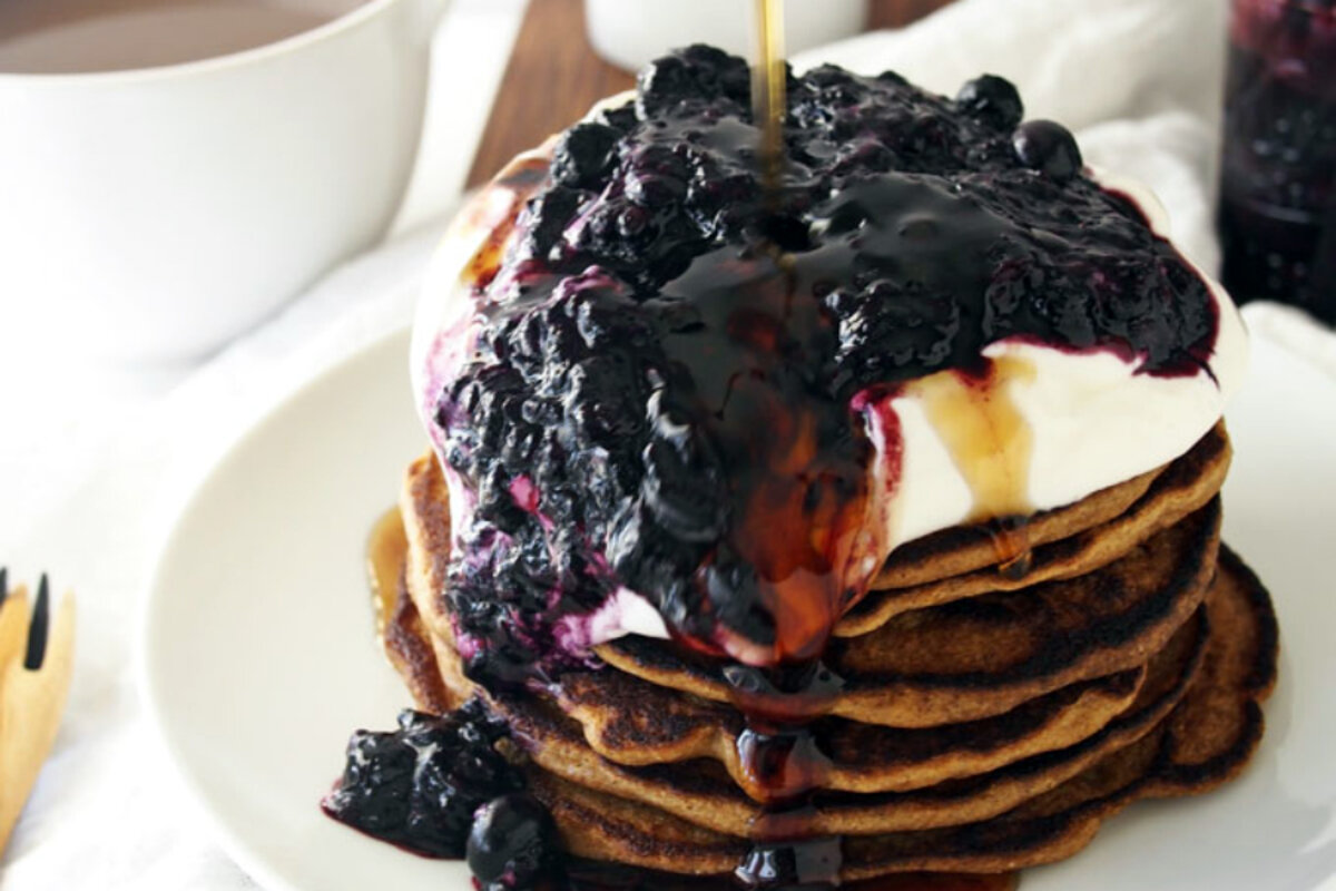 5. Serve the pancakes topped with yogurt, compote, and maple syrup!