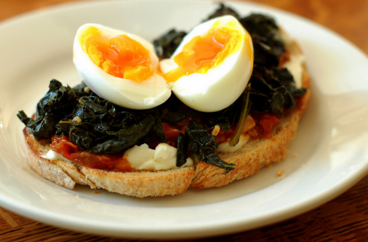 Savory toast: braised kale, roasted tomatoes, and soft-boiled eggs