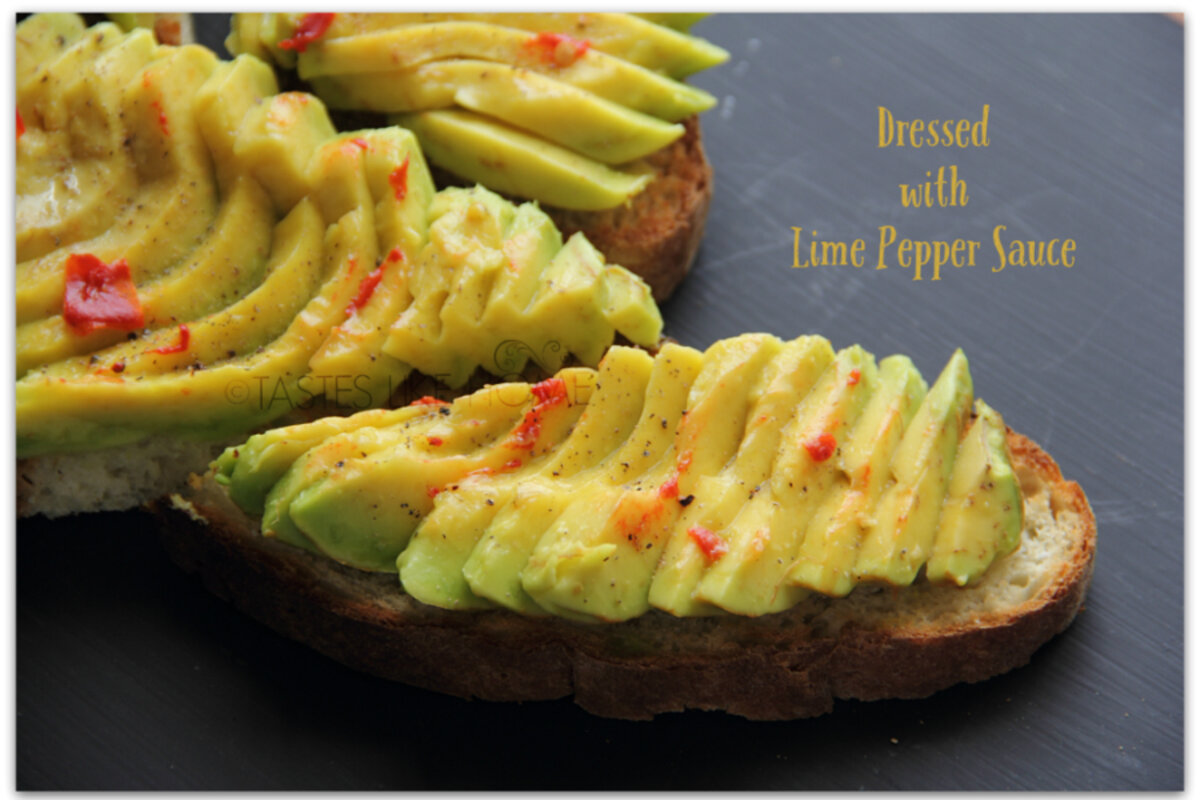 Made in the style of a bruschetta, I toasted artisan-style homemade bread then rubbed the crust with cut garlic, layered the sliced avocado and dressed it with the limey-brine of , along with freshly ground black pepper. The softened pepper from the pepper sauce was mashed lightly with the back of a spoon and carelessly smudged over the avocado.