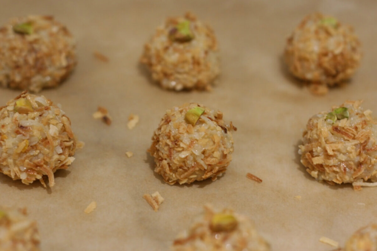 3. When the mixture has cooled completely, scoop up teaspoonfuls at a time and form 1-inch balls. Roll the balls in the toasted coconut and push a pistachio nugget into the top.