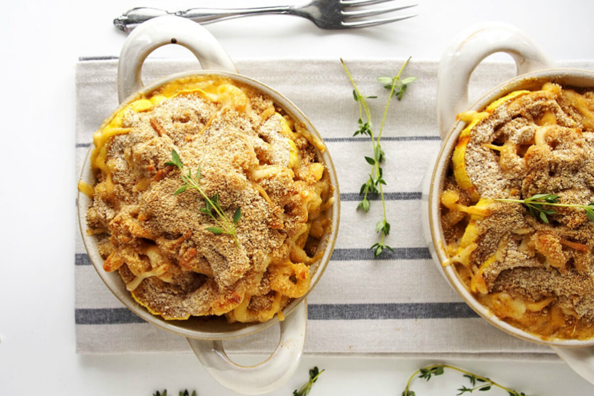 7. Combine the sauce and the pasta, and gently fold in the squash. Pour into a 9x13-inch baking dish, or smaller oven-safe dishes for individual servings. Top generously with dry breadcrumbs, and bake at 350 degrees F. for 20 minutes. The top should be turning golden!
