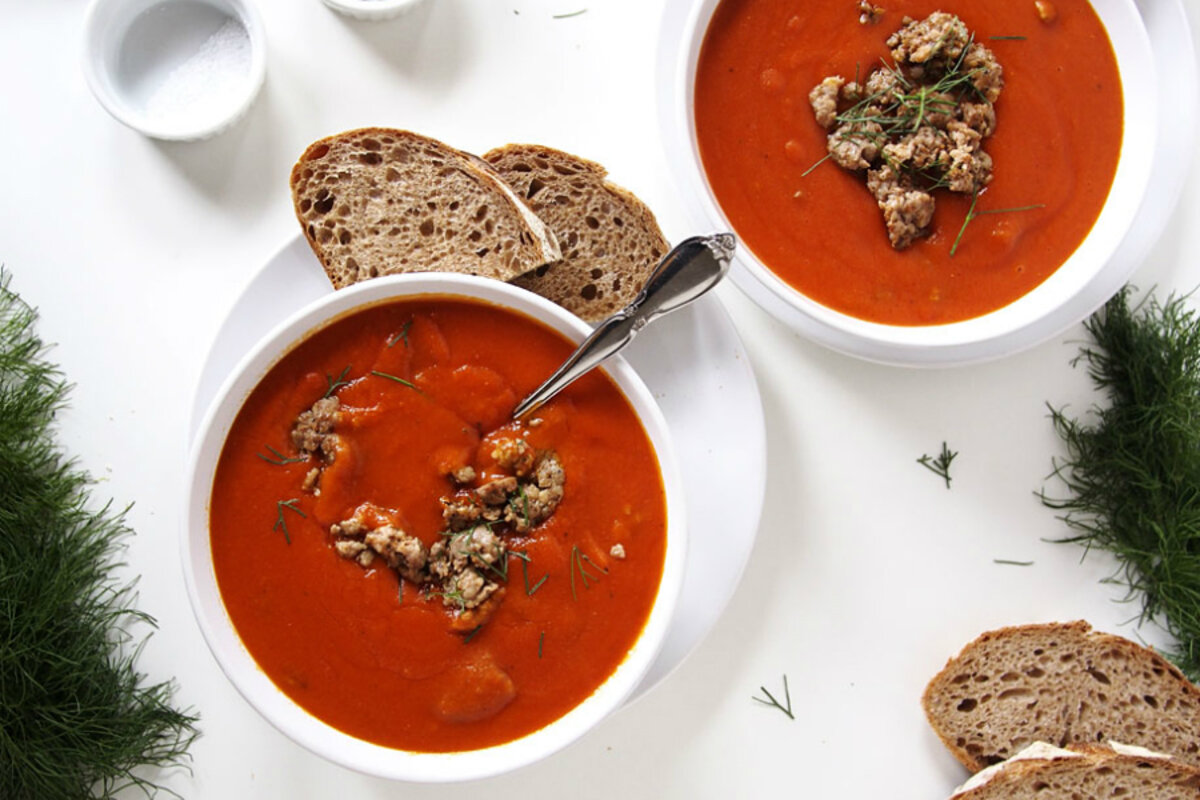 I went out to dinner with friends last weekend and the soup special on the menu was exactly this: tomato soup with sausage and fennel!