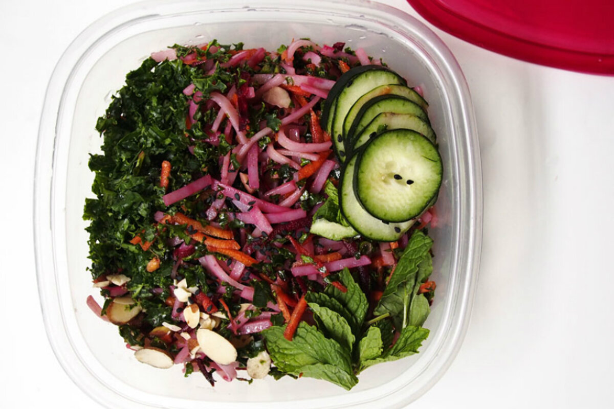Here鈥檚 the trick to preparing this in huge quantities in very little time: le food processor! I鈥檝e said it before, and I鈥檒l say it again: my food processor is hands down the best kitchen appliance I own. I cannot recommend it enough. I have a decades-old Cuisinart that works like a champ! For this project I used the s-blade (kale, cilantro, mint), the shredder (beets, carrots), and the slicer (cucumber, green onions). The most essential is probably the shredder 鈥 it saves you the most time.