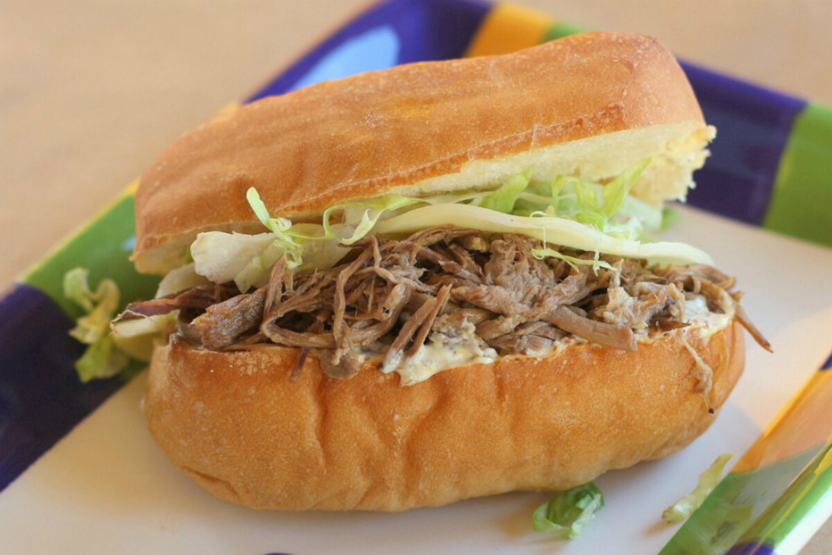 2. To serve, split the rolls and lightly toast on a cookie sheet in the oven. Spread on side of the bread with the creole spread. Use tongs to pile the beef onto the bread, then top the hot meat with a slice of cheese, then layer with shredded lettuce.