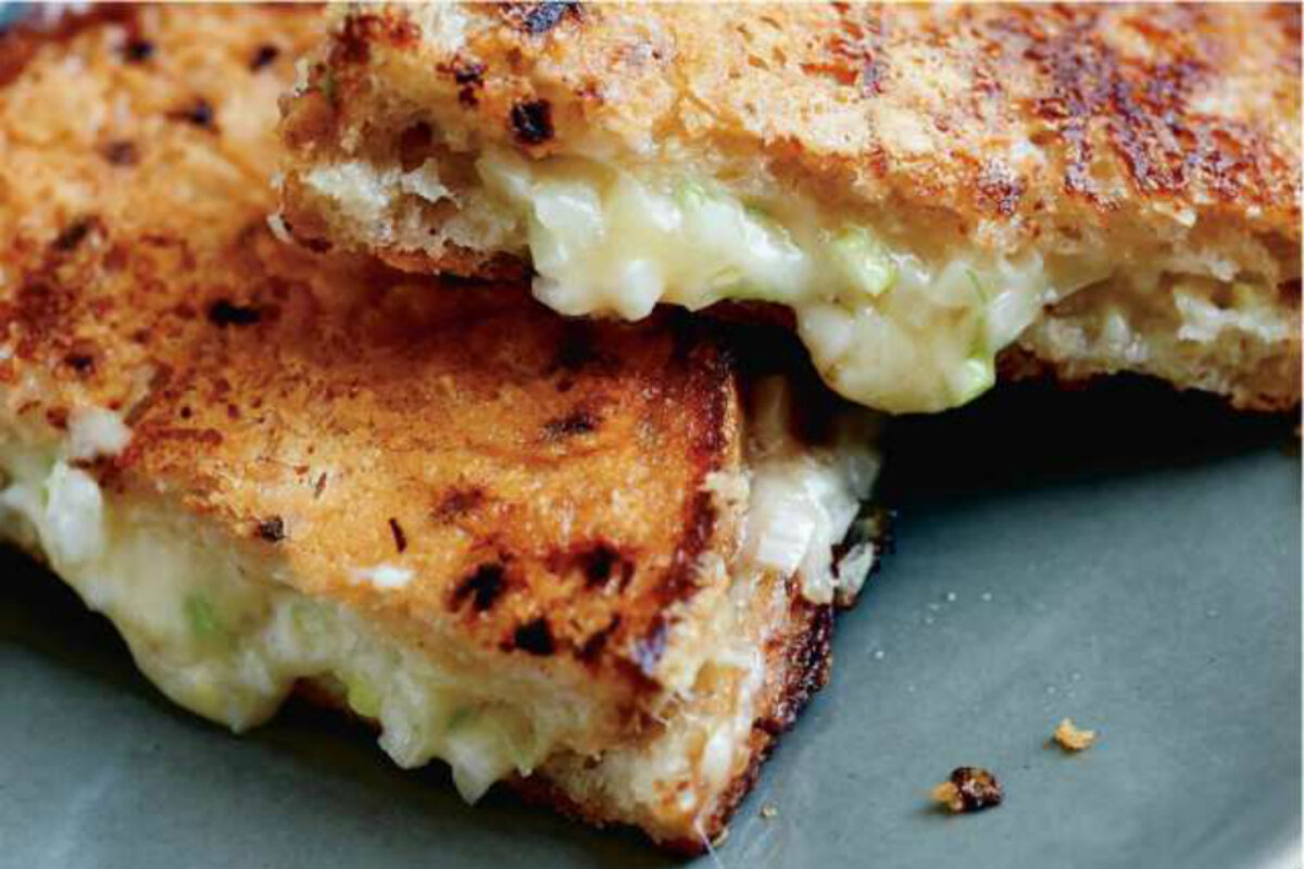 2. Butter one side of thickly sliced bread and heap as much of the mixture as possible between the slices. Spread a thin layer of mayonnaise on the outside of the bread (this will keep it from scorching on the griddle). Press the reserved grated cheese to the outside of the bread, where it will create a wonderfully crisp and shaggy crust, giving your sandwich an entirely new dimension.