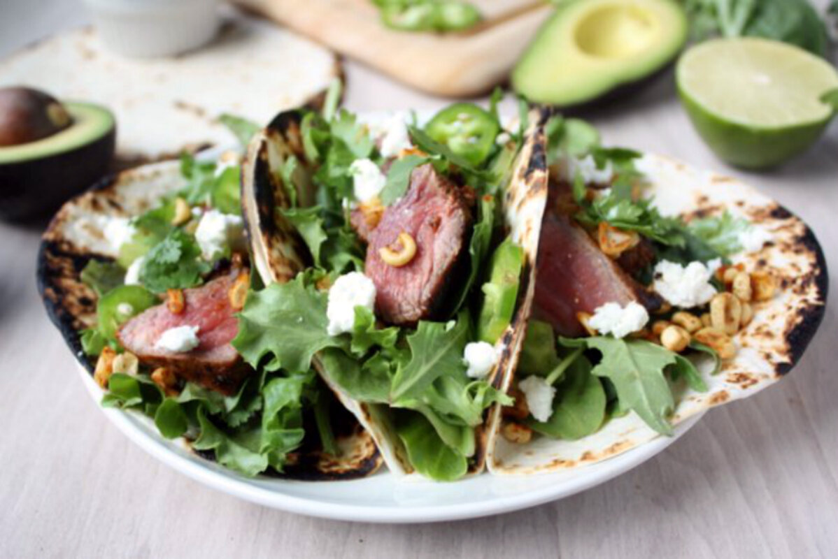 5. To assemble the tacos, first add salad greens to the tortilla, then goat cheese, jalape帽o, steak, avocado, corn, cilantro, and lime.