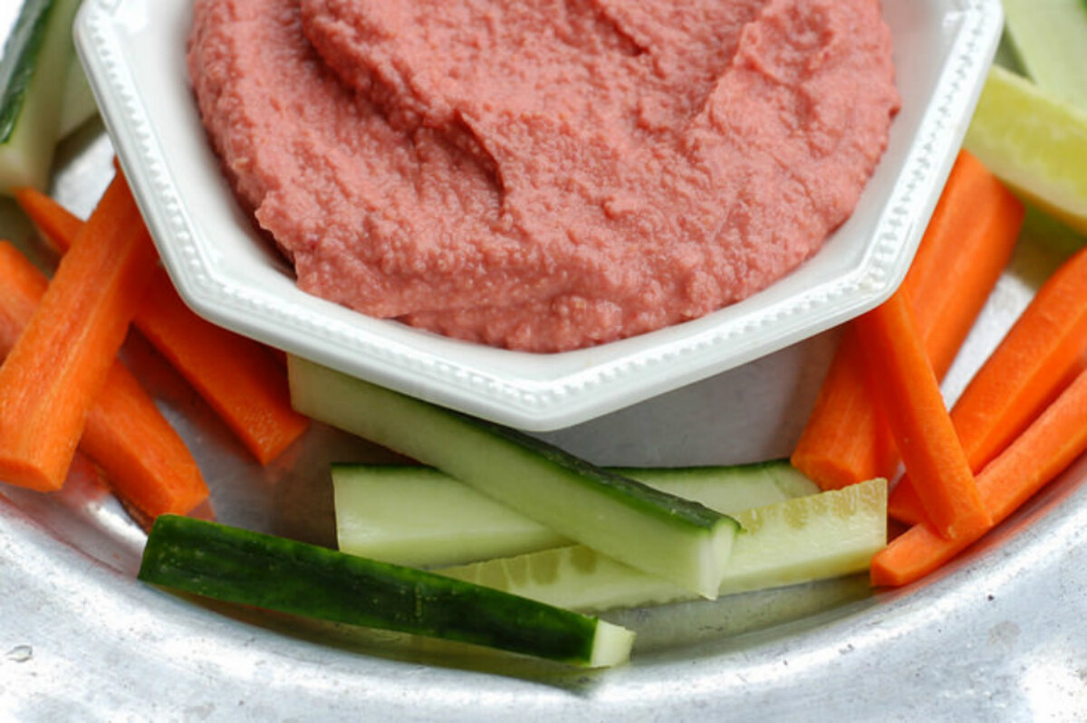 This hummus has got a lot going for it from its pretty color to the way the lemon and garlic provide a perfect foil for the sweet, earthy flavor of the roasted beets and the nuttiness of the chickpeas to the added folate, vitamin C, fiber, manganese and potassium the beets add to the protein-packed hummus.