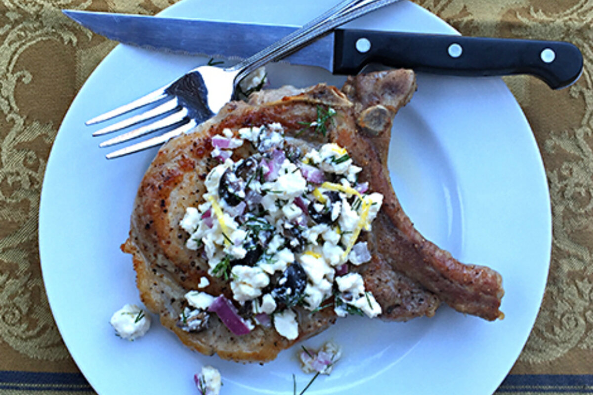 I鈥檝e been craving pork chops lately, and the idea of a mound of crumbled feta, chopped olives, dill and other yet-to-be-determined flavorings heaped on said chops sounded just about perfect. It was. My own version of the dip-turned-salsa included red onion for its sweetness, color and crunch, and lemon juice and zest. I pan seared the chops, but grilling them would add some smoky goodness. This would also be good on burgers or grilled chicken breasts and flat out amazing on lamb chops.