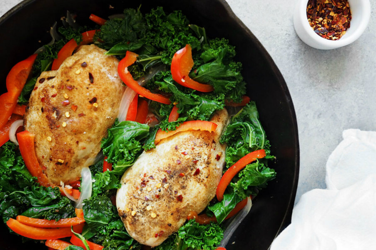 2. After 5 to 7 minutes, flip the chicken over and add the red pepper flakes and white wine. Cook another 5 minutes before adding the bell peppers, garlic, and onion. Stir gently around the chicken as the vegetables cook. After about 7 more minutes, when the chicken is nearly done, add the kale and gently cook it for 2 minutes, or until wilted.