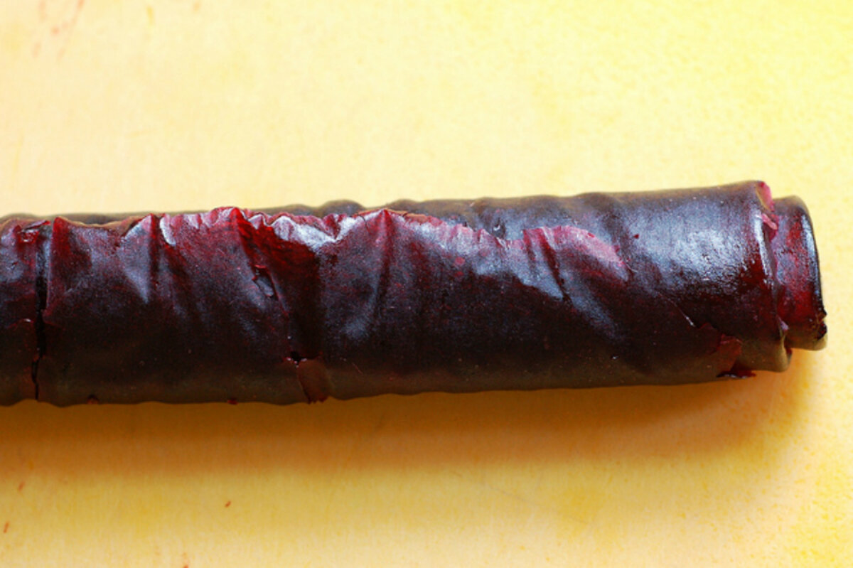 The resulting fruit leathers are beautiful and very delicious 鈥 sweet and intensely flavorful. Roll the sheet up and slice it to whatever width you'd like.