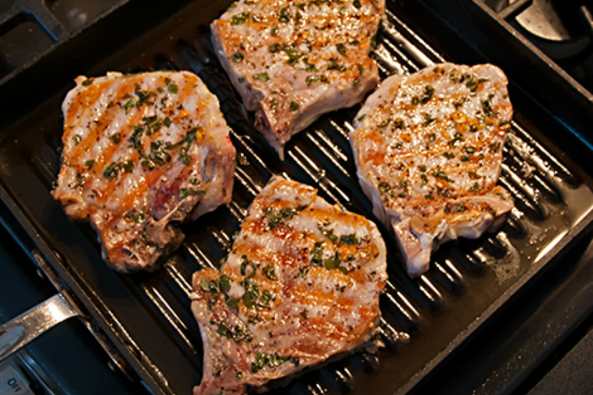 Why I like a grill pan for this.聽A grill pan will give you nice grill marks and is less likely to scorch the garlic than a skillet. You can also cook these chops on an actual grill, but I really liked the flavor of the basil and the garlic and the meat without an overlay of smoke.
