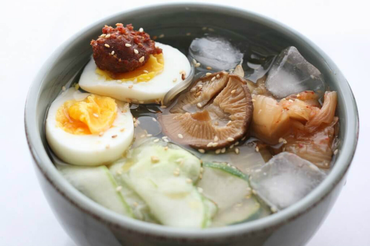 At home, a quick internet search revealed bibim naengmyeon鈥檚 blander cousin, mul naengmyeon. In this dish, the noodles are served swimming in a cold, tangy broth 鈥 made from beef, chicken or dongchimi, radish kimchi soaked in brine 鈥 sometimes floating with ice cubes or transformed into a granita/slushy.