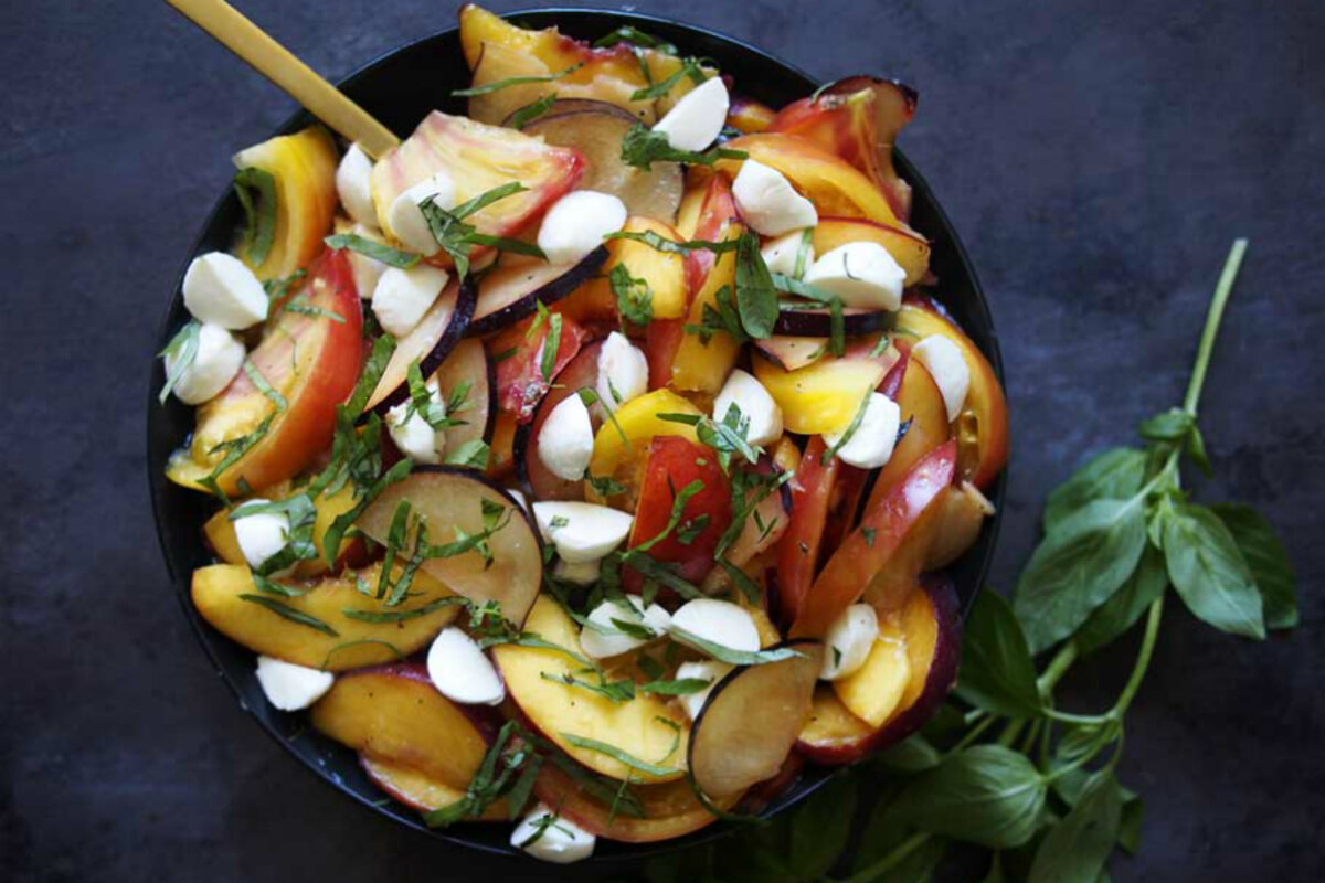 Stone Fruit & Heirloom Tomato Mozzarella Basil Salad
