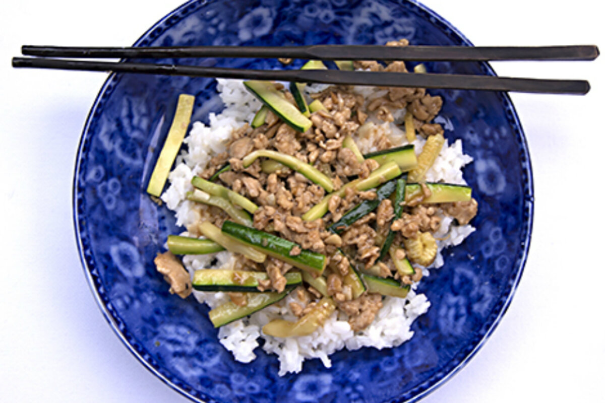 This quick weeknight recipe is inspired by Cantonese cooking, not by that summer of giant zucchini. It is super fast and delicious. It uses nice, dark green, little zucchini 鈥 about half a pound or so 鈥 cut into slender matchsticks. They will cook up a treat in no time and, because they are small and fine, will taste of the lovely summer garden, rather than of cardboard and vanity.