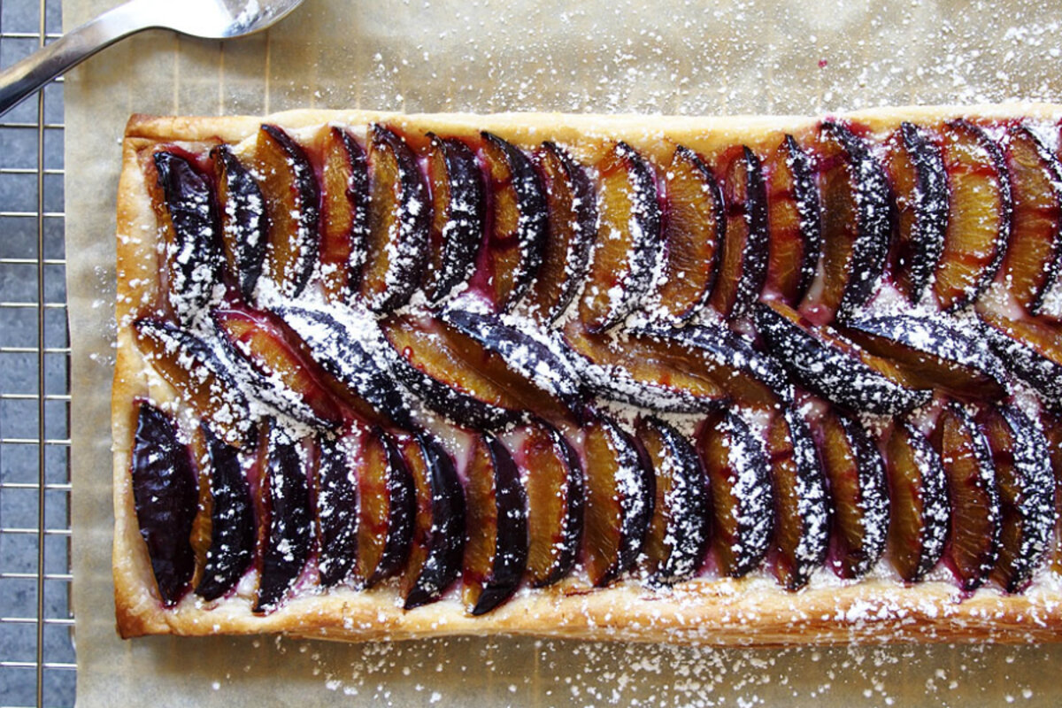 This recipe was thrown together based on one criteria, which is a frequent one around here: what鈥檚 in the fridge? What can I use up? Frozen puff pastry, cream cheese, and the plums. Add some sugar and vanilla, and this is literally a five-ingredient tart! I had some frozen puff pastry from Grand Central Bakery on hand, which was plentiful. I actually made about five of these, since the roll just kept on going!