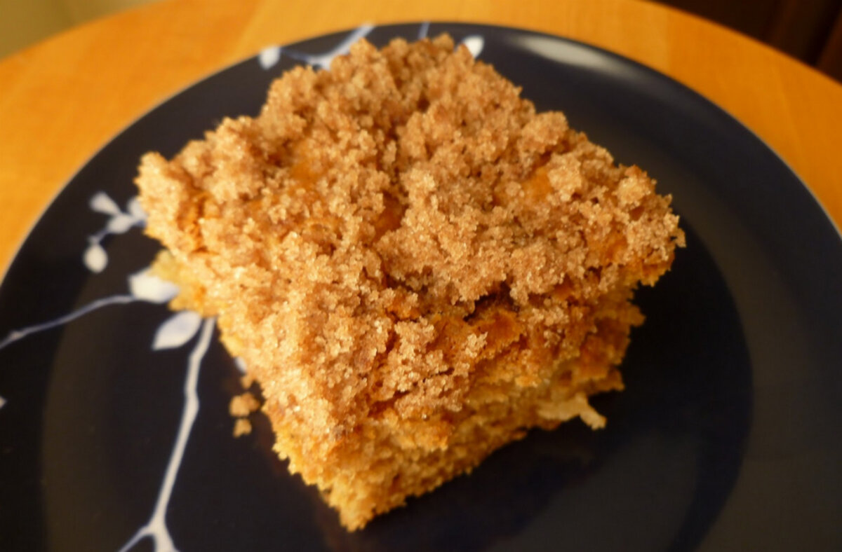 3. In a small bowl, combine sugar, cinnamon and butter, mixing with a fork. Spread evenly over the batter. Bake for 40-45 minutes or until golden brown and a toothpick inserted near the middle comes out clean or with a few crumbs. Serve warm or at room temperature.