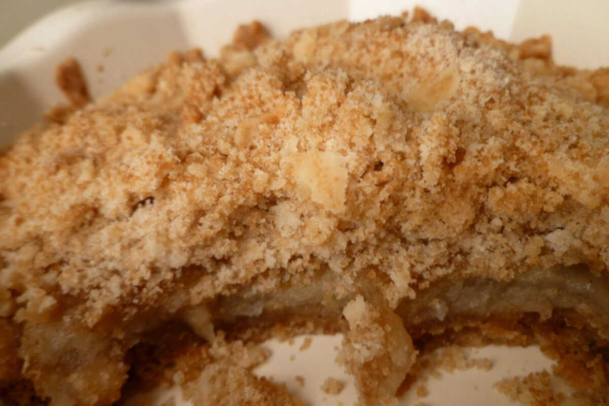 It鈥檚 hard for me to take a good picture of cobbler. I don鈥檛 know why. I鈥檝e tried and I鈥檓 not a good enough food photographer to stage the dish or a serving of it so that you can appreciate the perfect blend of tart apples (they don鈥檛 come out clearly enough under the streusel topping) supported by the crust (can鈥檛 see it clearly under the apple filling) and complemented by the sweet streusel. Serve warm with vanilla ice cream and you have a winner.