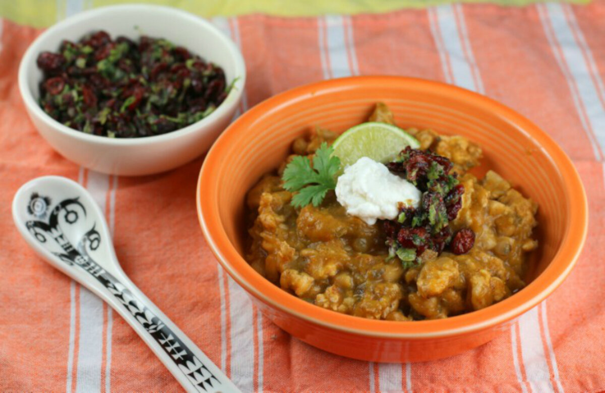 Turkey, pumpkin, and white bean chili with cranberry relish