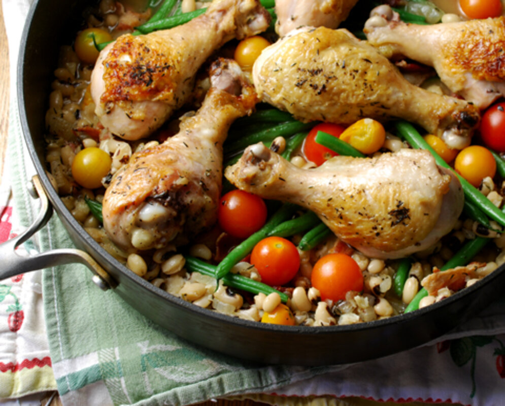 One-skillet Chicken with Black-eyed Peas and Cherry Tomatoes