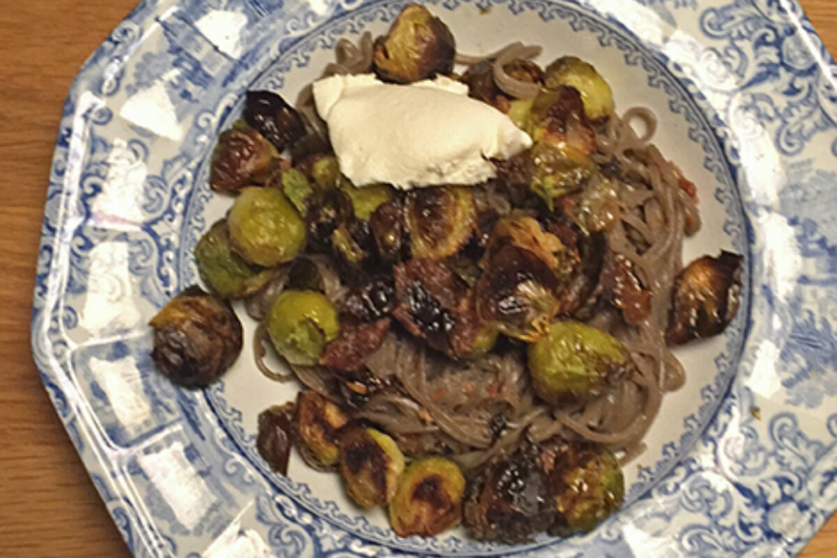 Roasted Brussels sprouts with bacon jam and udon noodles