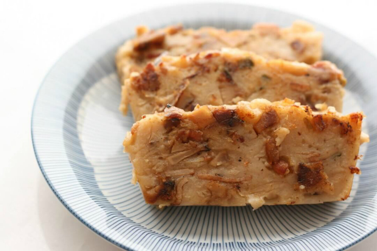 8. Once cooled, loosen the sides with a spatula and turn it out onto a cutting board. Dip a sharp knife in water and slice into 1/2-inch thick pieces. You can enjoy the turnip cake immediately but I like to pan-fry them first.