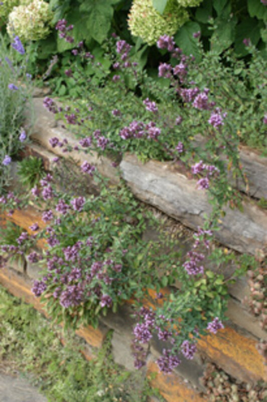 Peeking out of cracks in a long wall winding along a garden pathway are magenta miniature carnations, phlox with delicate pink blossoms, rosettes of hen and chicks, and fragrant herbs such as thyme and lavender.