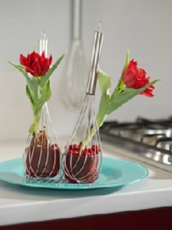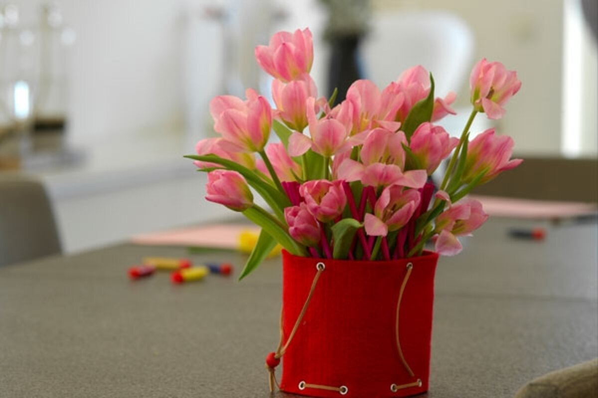 Get red tulips, add heart-shaped red paper cut-outs or candies. Or get a bright red vase and any color flower will convey that Valentine鈥檚 mood.