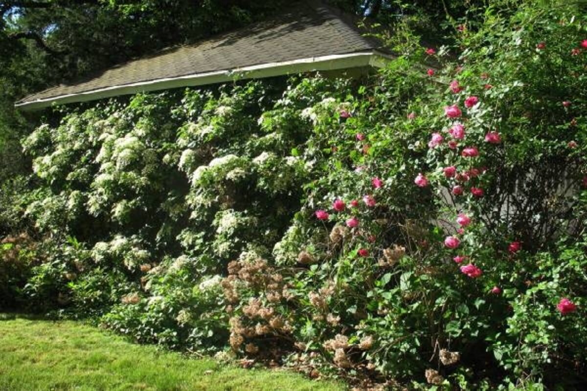 The garage is still there, but you can't see it anymore. Nine years ago I planted a single climbing hydrangea a couple of feet from the base of the garage, and after a slow start, it has almost completely covered the wall.
