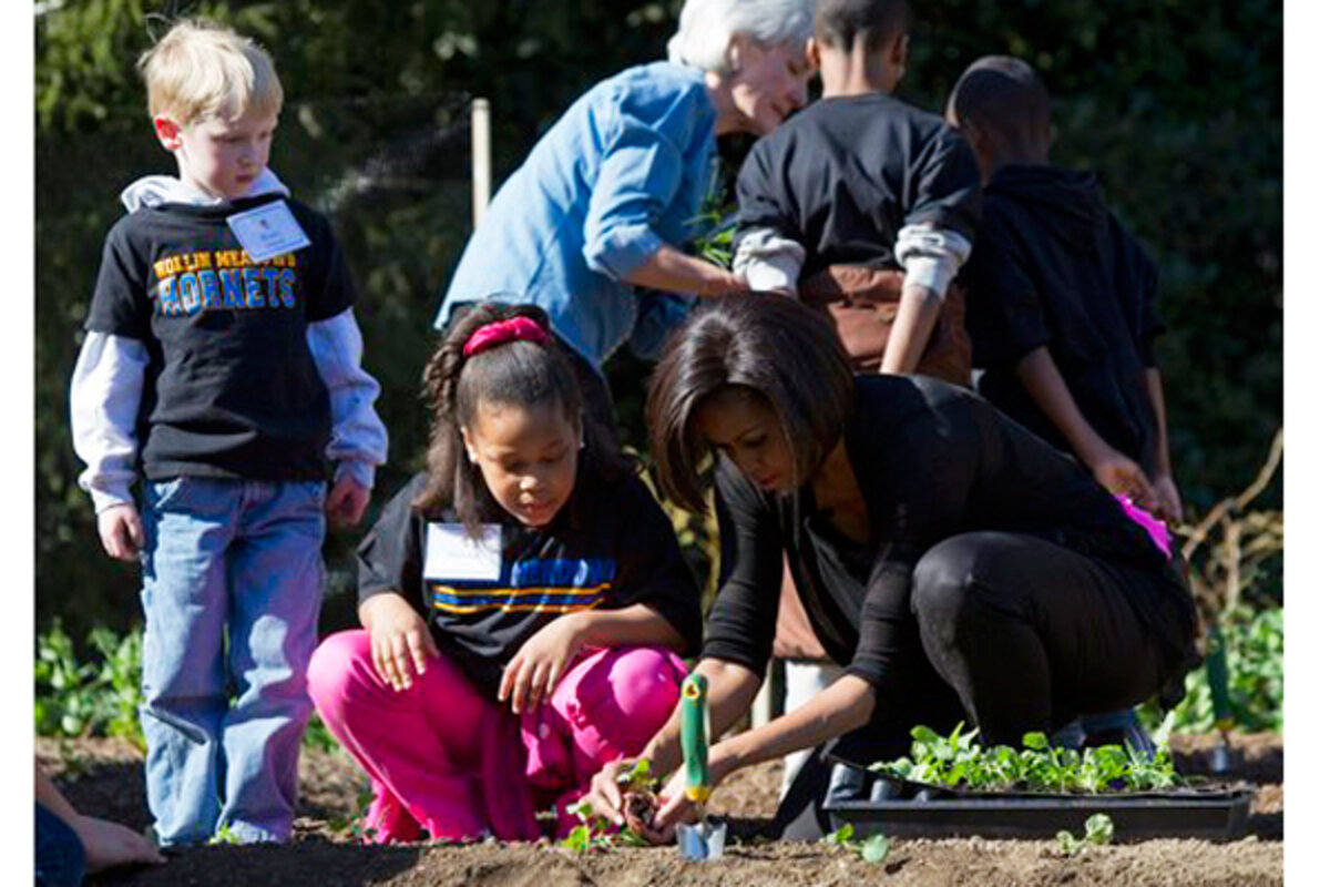 To illustrate that point, the first lady knelt in the 1,500-square-foot garden and planted two rows of broccoli as well as some rhubarb.